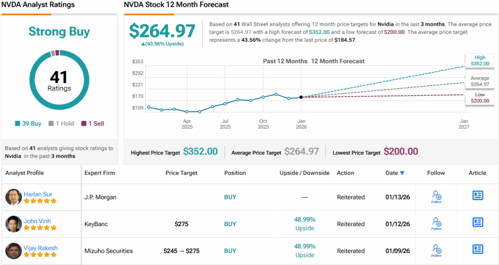 거의 모든 다른 애널리스트들이 그 견해에 동의한다. 39개의 매수 대 각각 1개의 보유 및 매도를 기반으로, 주식은 강력 매수 컨센서스 등급을 주장한다. 평균 목표주가 264.97달러를 기준으로 하면, 주가는 1년 기간 동안 43% 상승할 것으로 예상된다. (NVDA 주가 전망 참조)
