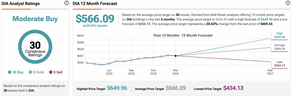 월가는 DIA 주가가 상승할 여지가 있다고 보고 있다. 지난 3개월 동안 증권가는 DIA 평균 목표주가를 566.09달러로 제시했으며, 이는 현재 가격 대비 20.62%의 상승 여력을 시사한다. DIA의 30개 보유 종목은 매수 30건, 보유 0건, 매도 0건의 투자의견을 받고 있다.