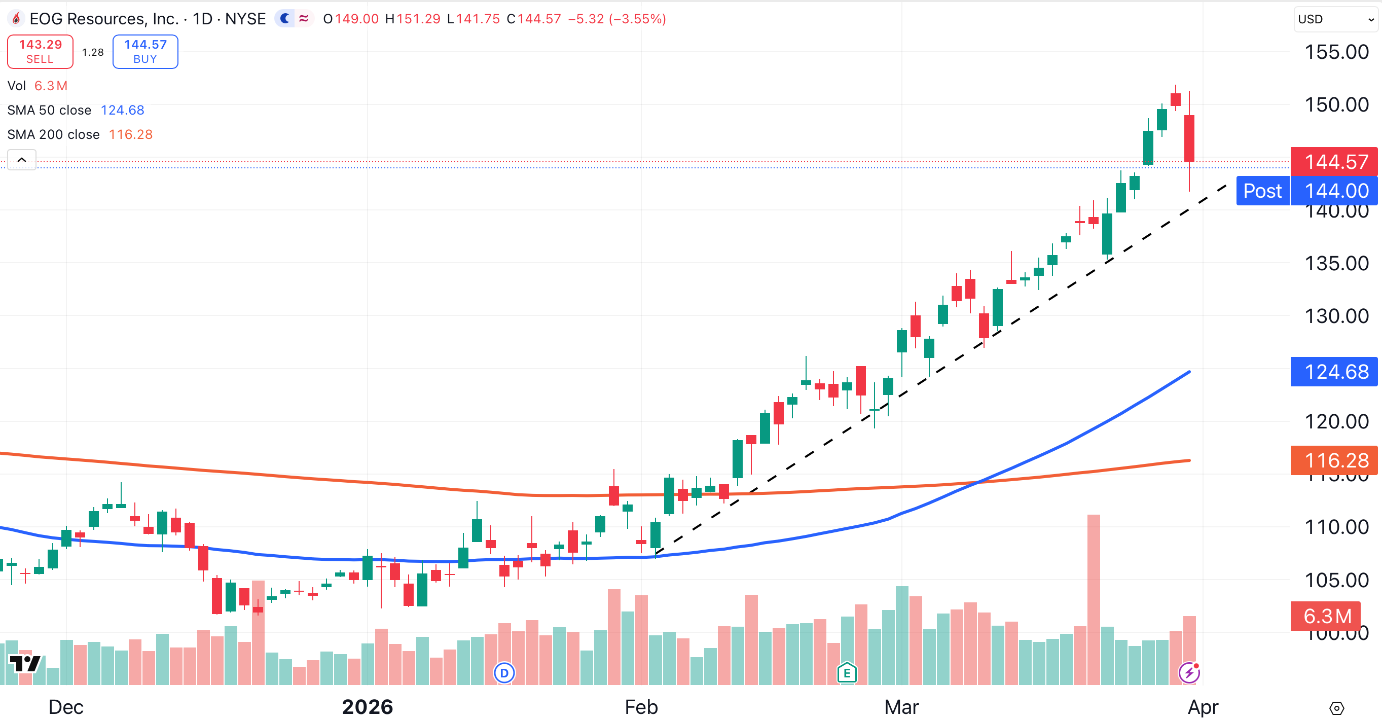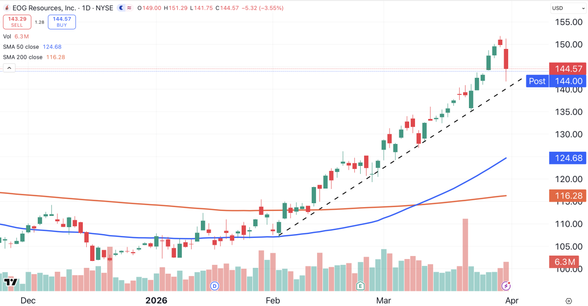 차트를 기준으로 볼 때, EOG 리소시스는 추세선(검은 점선) 근처인 138~140달러 영역에서 매수하는 것이 좋겠다. 주가가 52주 이동평균선(파란색) 아래로 떨어지면 청산할 것이다.