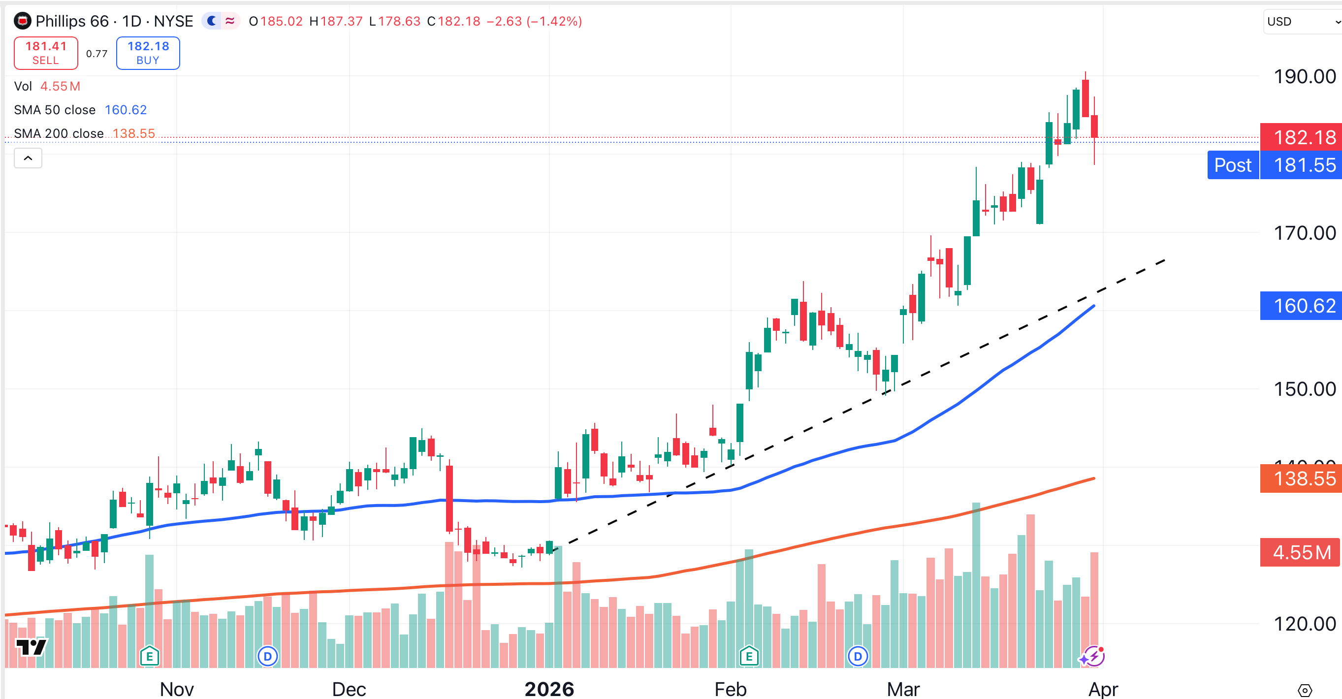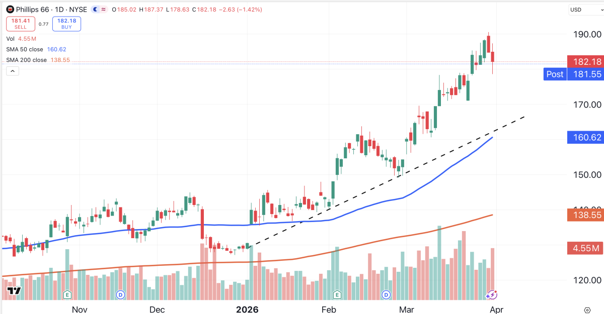 필립스 66의 추세선과 50일 이동평균선(파란색)은 이 주식에 지지를 제공하며, 현재 배당수익률은 2.79%다.