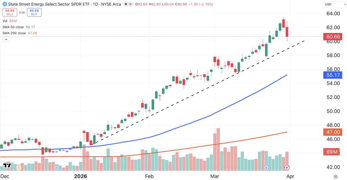 평화에 대한 희망이 떠오르면서 에너지 주식에서 자금이 빠져나가고 있지만, 위 차트에서 볼 수 있듯이 강세 추세는 여전히 유지되고 있다. XLE가 58~59달러 영역으로 더 깊이 조정받을 가능성이 있어 보이며, 그렇게 되면 에너지 ETF는 강세 추세선(검은 점선) 위에 놓이게 된다. XLE는 3월 11일 해당 추세선에서 급격히 반등했다.