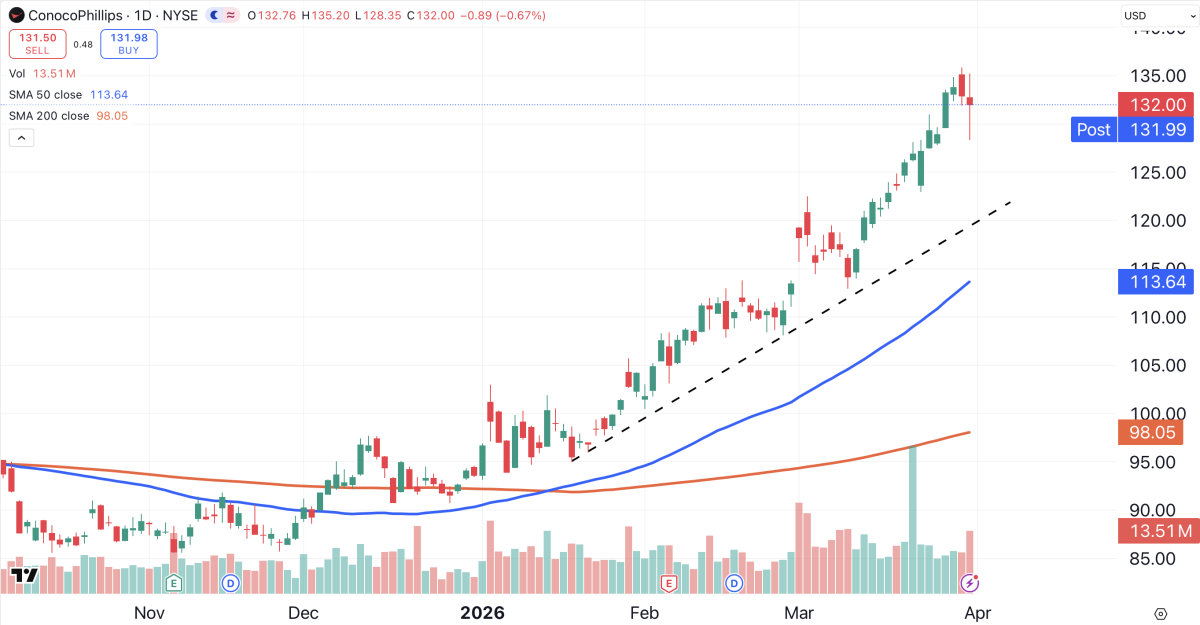 이 경우 122달러의 진입 지점에 도달하려면 더 깊은 조정이 필요할 것이다. COP의 배당수익률은 2.45%다.