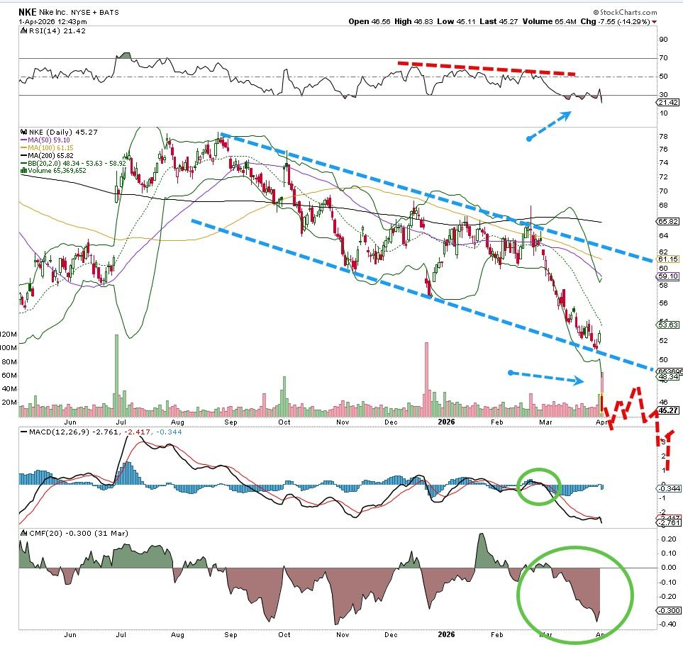 수요일 나이키(NKE)는 최근 분기 실적을 공개했는데, 투자자들은 감명받지 못한 것으로 보인다. 사실 투자자나 트레이더에게 매수 신호를 주는 하단 지지선이 전혀 없다. 이는 매수세에게 복잡한 상황이다.