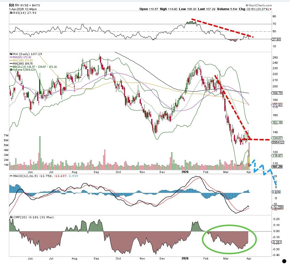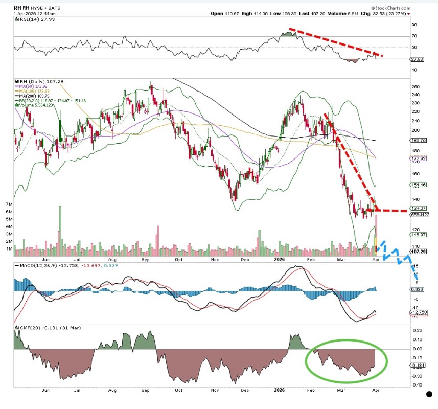 구 레스토레이션 하드웨어인 RH(RH)의 분기 실적은 끔찍했다. 주가는 수 주 동안 심하게 타격을 받았으며, 낮아지는 고점과 저점 추세를 보이고 있는데, 이는 하락 추세의 교과서적 정의다.