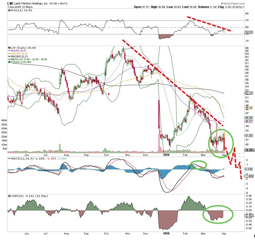 모든 잠재적 반등이 매도되었고, 자금 흐름은 약세이며, MACD는 이제 새로운 매도 신호를 보이고 있다. 우리가 보기에 더 많은 하락 여지가 있다.