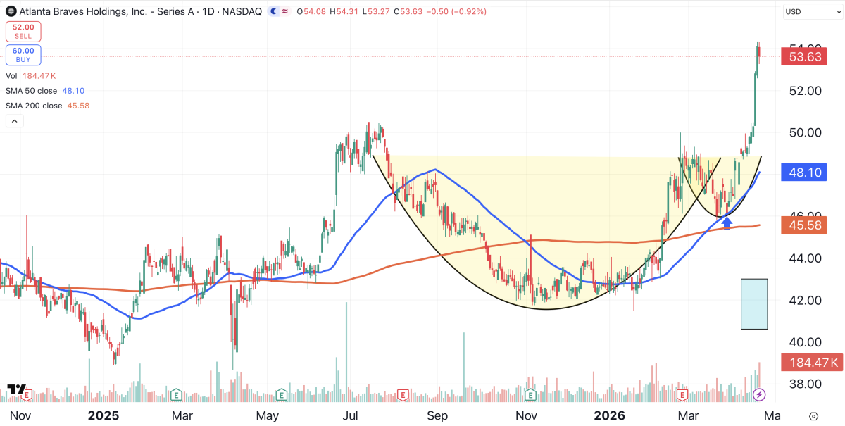 이 과정에서 애틀랜타 브레이브스 홀딩스는 지난 9개월간 형성된 컵 앤 핸들 패턴(노란색 음영)을 돌파했다. 이 돌파 이후 주가는 거래량이 급증하면서(파란색 음영) 상승세를 이어가고 있으며, 이는 기관 자금이 이번 상승의 주요 동력일 수 있음을 시사한다.