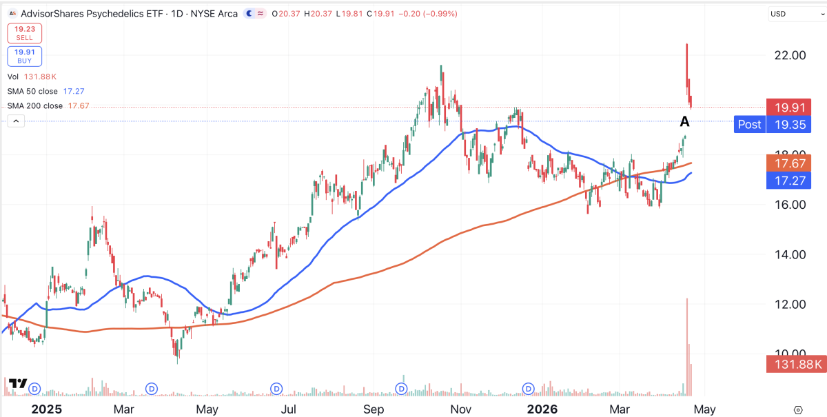 어드바이저셰어스 사이키델릭스 ETF(PSIL)는 월요일 개장 시 수년 만의 고점에 도달했고, 이후 하락세를 보이고 있다. PSIL은 월요일의 갭(A 지점)을 메우고 18.80달러 영역으로 되돌림할 경우 잠재적 매수 기회가 된다.