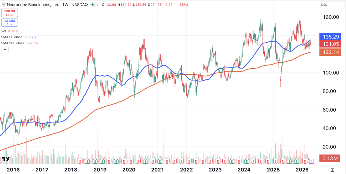 시가총액 131억5000만 달러의 뉴로크라인 바이오사이언시스(NBIX)는 환각제 섹터에서 가장 큰 시가총액 중 하나를 보유하고 있다. 이 회사는 거의 30년간 상장 기업으로 운영되어 왔다.