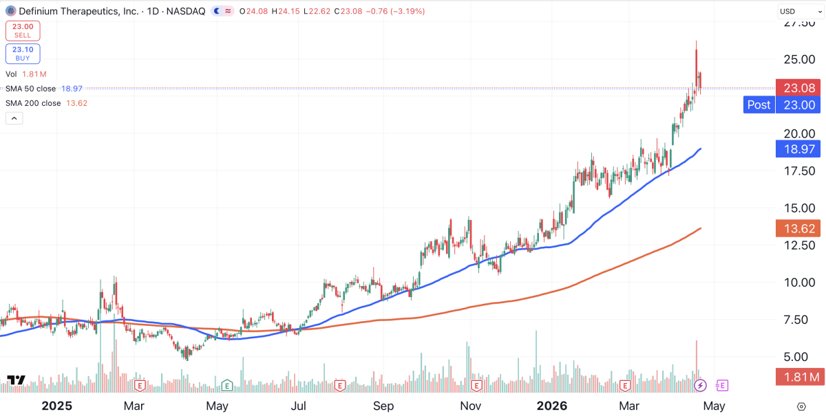 이전에 마인드메드로 알려진 디피니엄 테라퓨틱스(DFTX) 주가는 올해 이미 68% 상승했다. 지난 12개월간 주가는 거의 4배 증가했다.