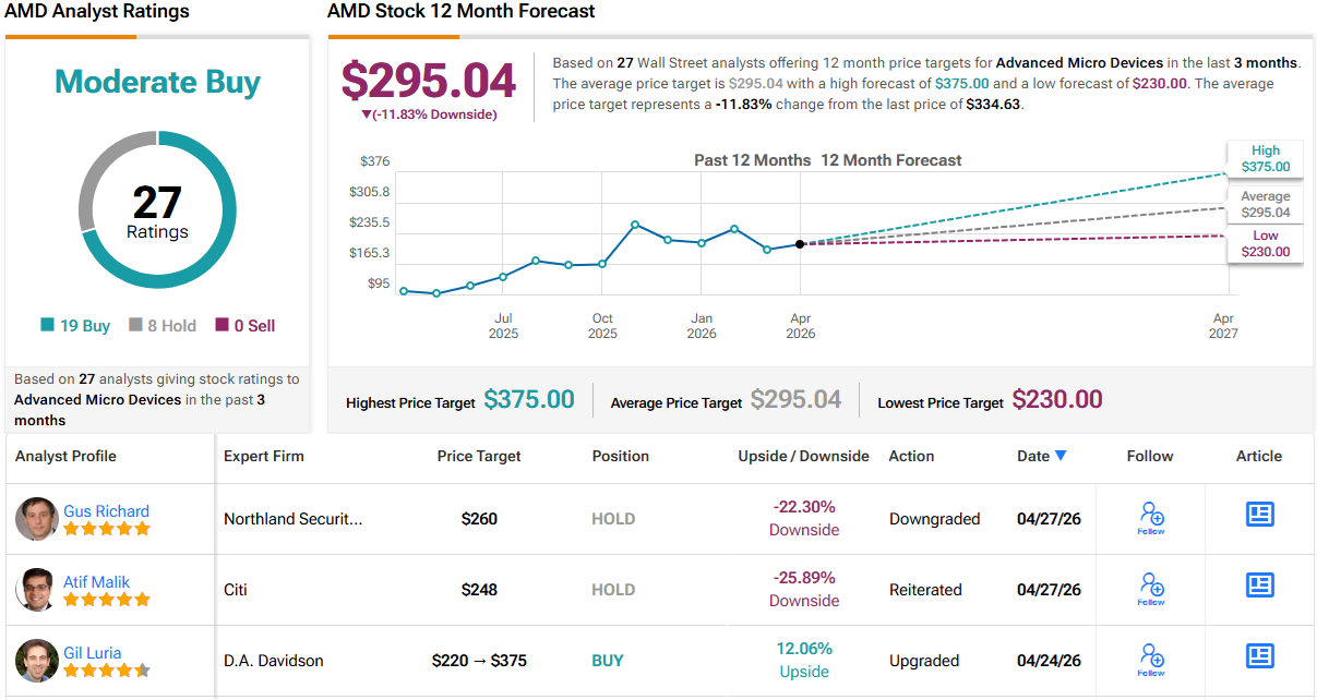 루리아는 이제 매수 등급을 부여한 18명의 다른 AMD 강세론자들과 합류했지만, 추가로 8명의 보유 의견이 있어 컨센서스 전망은 중간 매수다. 한편 주식의 대폭적인 상승으로 주가는 평균 목표주가 295.04달러를 12% 상회하고 있다. 이를 염두에 두고 곧 더 많은 수정이 있을 것으로 예상된다. (AMD 주가 전망 참조)