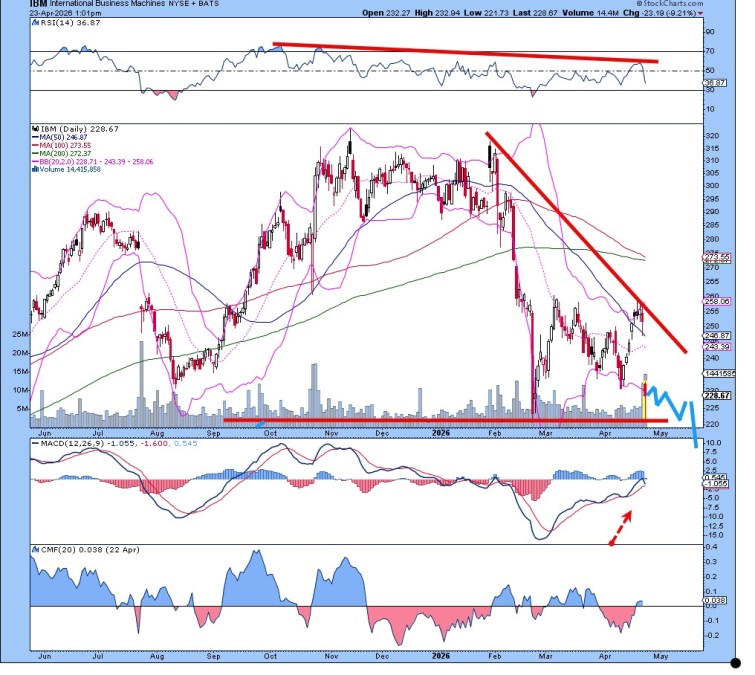 빅 블루로도 알려진 IBM(IBM)은 이제 "검푸른 멍"이라고 불릴 가능성이 더 높다. 차트는 하락하는 고점에서 큰 움직임을 보여주며, 저점과 고점이 모두 낮아지고 있다. 이것은 하락 추세의 교과서적인 신호이며, 최근 실적 발표에도 불구하고 주가는 반등하지 못했다. 매도세의 무게가 주가를 짓눌렀고, 이제 큰 거래량과 함께 하락 압력이 더욱 커지고 있다.