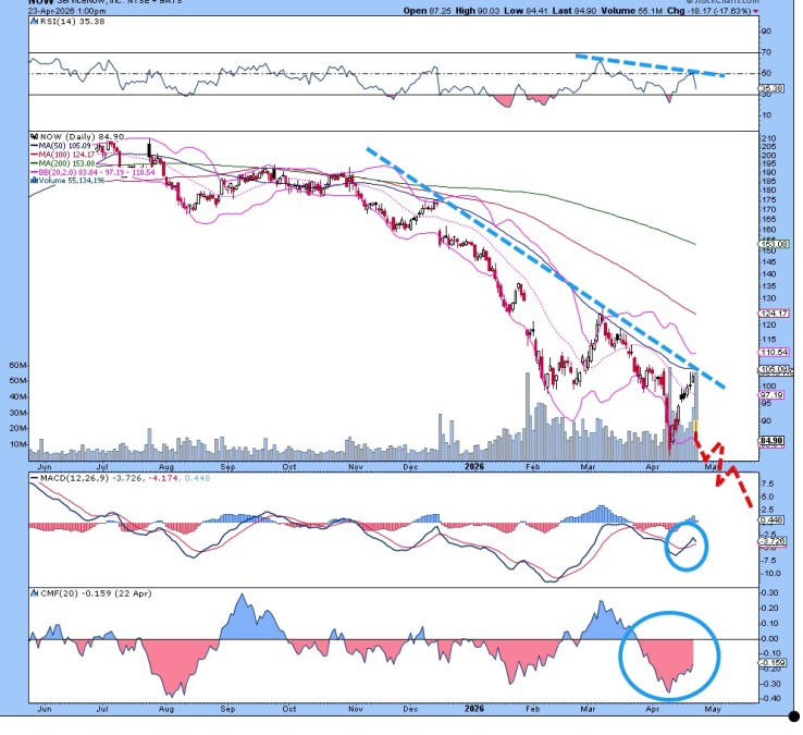 한때 훌륭한 신생 기업이었던 서비스나우(NOW)는 자체적으로 벗어나지 못하고 있다. 한때 소프트웨어 서비스를 지배할 것으로 여겨졌지만, 2025년 여름 이후 급락하면서 이제는 과거의 그림자에 불과하다. 이 회사가 형편없이 관리되고 있거나, 아니면 AI의 위협이 현실화되고 있다는 점은 의심의 여지가 없다. 어떤 경우든 투자자들은 여기에 전혀 관심이 없다. NOW는 최근 매수세를 찾는 듯했지만, 4월 23일 실적 발표 이후 모두 타격을 입었다.