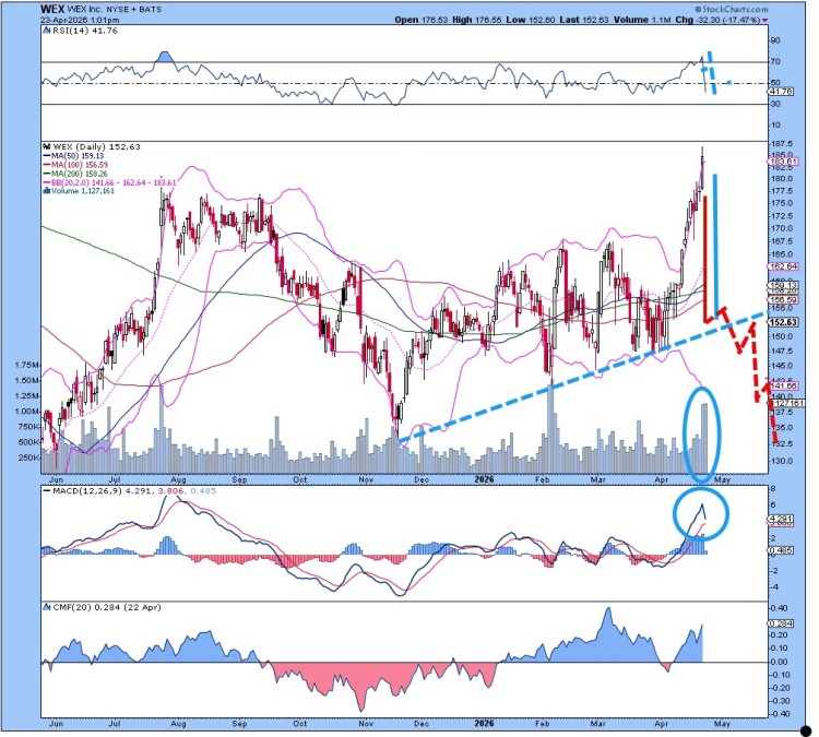이번 주 WEX(WEX)의 반전은 놀랍다. 지난 한 달간 양호한 거래량과 함께 급등했던 주가가 한 세션 만에 모두 잃었고, 2월 이후 볼 수 없었던 거래량으로 급락했다. 하락이 상승 추세선을 뚫지는 않았지만, 이 차트가 얼마나 약세인지 이해할 수 있다. 그 선은 조만간 돌파될 것이다.