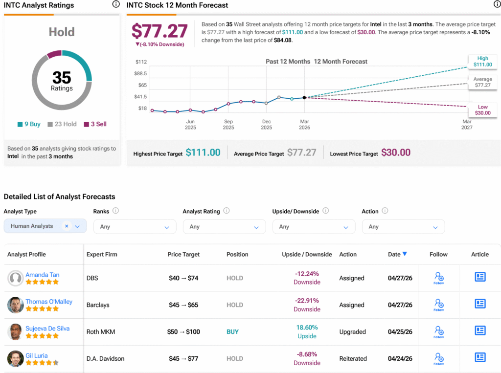월가 증권가는 지난 3개월간 매수 9건, 보유 23건, 매도 3건의 의견을 제시하며 INTC 주식에 대해 보유 의견을 유지하고 있다. 지난 1년간 주가가 317.85% 상승한 후, 평균 INTC 목표주가는 주당 77.27달러로 8.1%의 하락 여력을 시사한다.