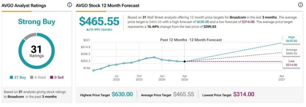 브로드컴은 현재 최근 3개월간 이 종목을 커버한 월가 애널리스트 31명의 의견을 바탕으로 매수 27건, 보유 4건, 매도 0건으로 구성된 강력 매수 컨센서스 등급을 받고 있다. AVGO의 평균 12개월 목표주가는 465.55달러로, 현재 주가 399.83달러 대비 약 16.5%의 상승 여력을 시사한다.