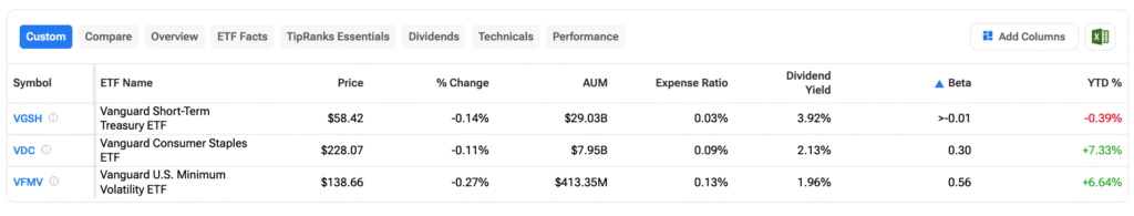 세 가지 중 VGSH는 자본 보존을 위한 가장 안전한 선택지로, 변동성이 최소화되고 시장 위험이 거의 없다. 한편 VDC는 중간 지점을 제공하며, 변동폭을 줄이면서 주식 노출을 제공한다. VFMV는 세 가지 중 베타가 0.56으로 가장 높아 약간 더 위험하다. 세부 내용을 살펴보자.