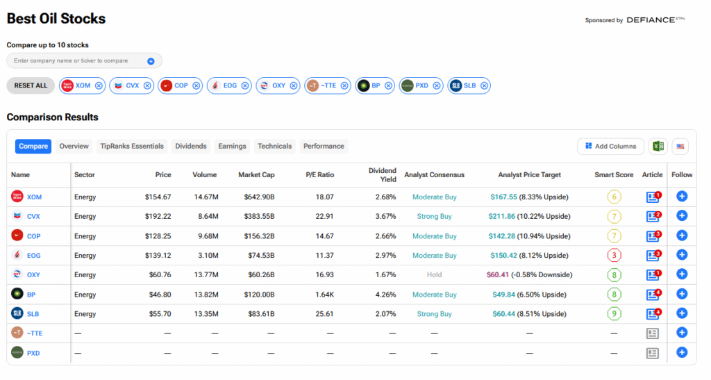팁랭크스 비교 도구를 사용하여 지금 매수하기 좋은 최고의 석유 주식을 정리했다. 아래에서 볼 수 있듯이 코노코필립스(COP)가 10.94%로 가장 높은 상승 여력을 보이고 있다.