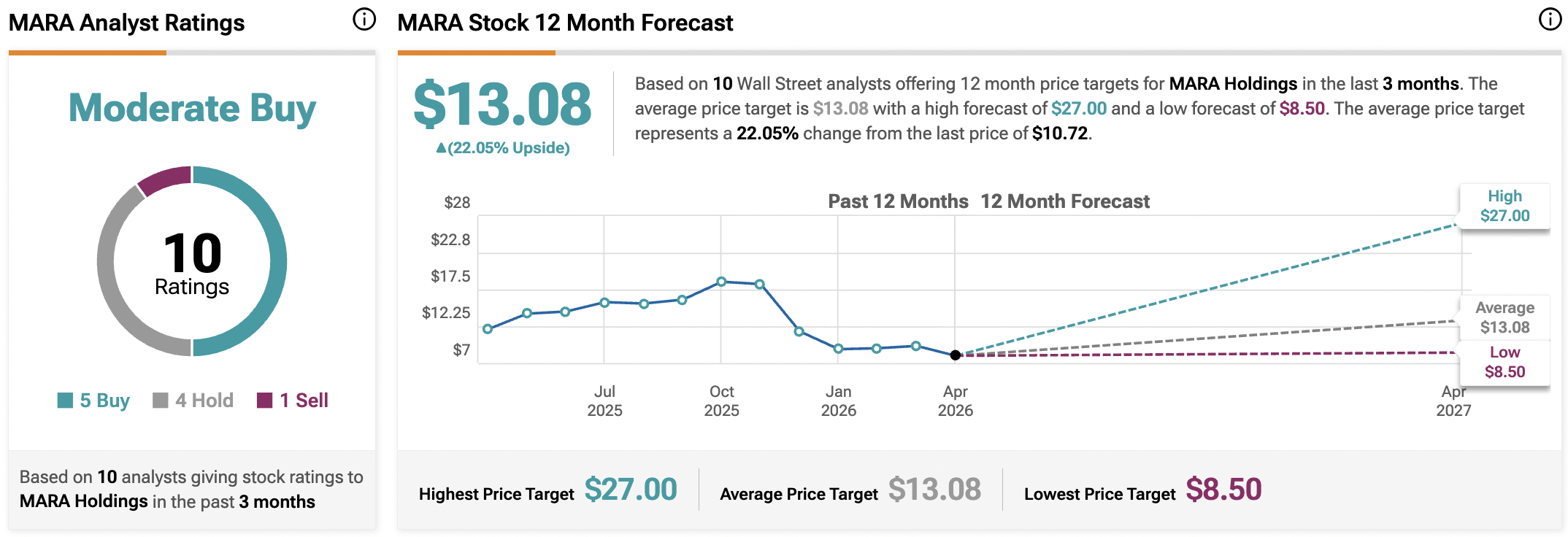 팁랭크스에 따르면 MARA 주식은 지난 3개월간 5건의 매수, 4건의 보유, 1건의 매도 의견을 받아 보통 매수 컨센서스 등급을 기록했다. MARA 주식의 평균 목표주가는 13.08달러로, 현재 수준에서 22%의 상승 여력을 시사한다.