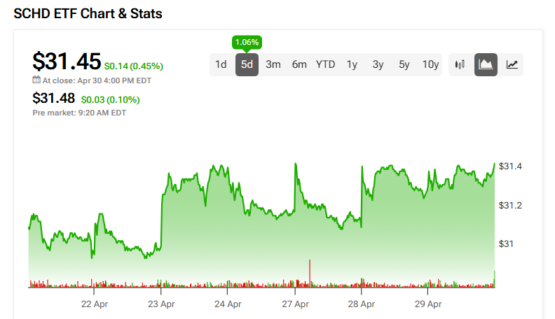 전반적으로 SCHD는 지난 5일간 1.06% 상승했으며 연초 대비 16% 상승했다. 안정적인 배당 수익과 안정적인 현금흐름을 보유한 성숙 기업에 대한 집중이 펀드를 계속 뒷받침하고 있다.