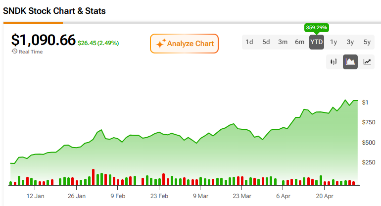 샌디스크 주식의 지난 12개월간 3,100% 이상 랠리는 독특한 문제를 야기했다. 주가가 급등하면서 현재 주당 약 1,086달러에 거래되고 있다. 이는 높은 가격대로, 일부 투자자들에게는 부담스러울 수 있다.