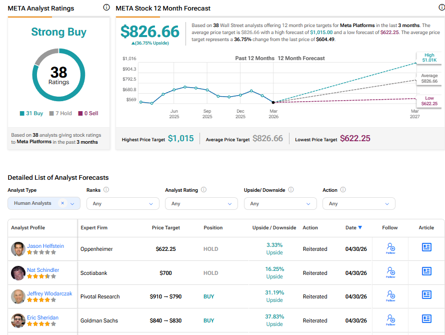 월가로 눈을 돌리면, 애널리스트들은 지난 3개월간 31건의 매수와 7건의 보유 의견을 바탕으로 메타 주식에 대해 강력 매수 컨센서스 등급을 부여했다. 또한 메타 평균 목표주가는 주당 826.66달러로 36.75%의 상승 여력을 시사한다.