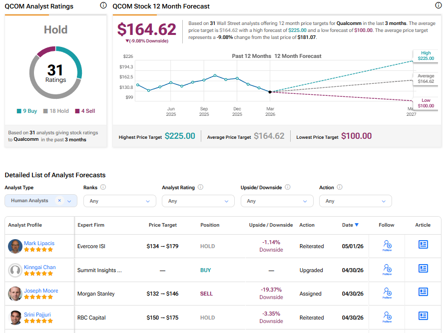 월가로 눈을 돌리면, 애널리스트들은 지난 3개월간 9건의 매수, 18건의 보유, 4건의 매도 의견을 바탕으로 퀄컴 주식에 대해 보유 컨센서스 등급을 부여했다. 또한 평균 QCOM 목표주가는 주당 164.62달러로 9.08%의 하락 여력을 시사한다.