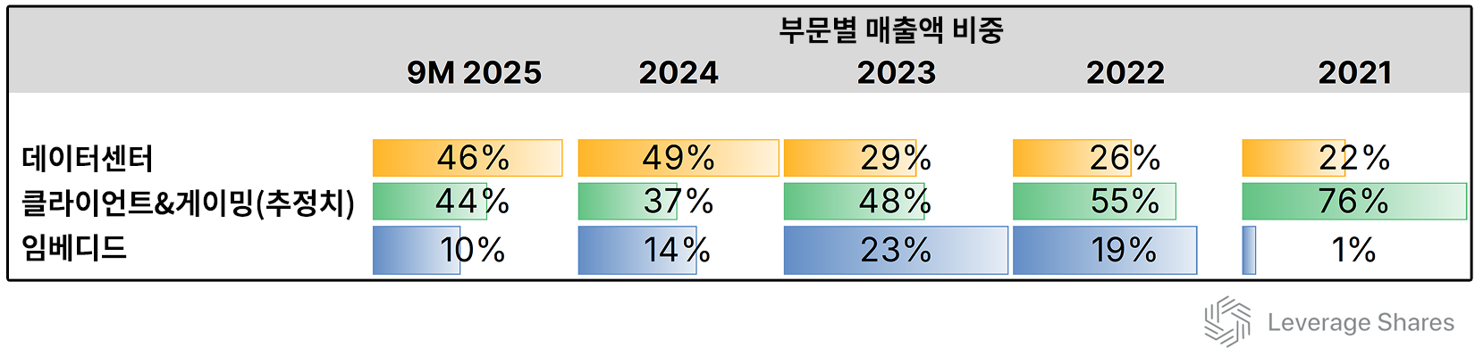 반면 ‘임베디드’ 부문 매출은 전년과 비슷하거나 소폭(2%) 감소할 가능성이 있었다. 데이터센터 부문은 전년 대비 19% 성장에 그칠 것으로 보여, 2024 회계연도의 94% 성장세에 비해 크게 둔화됐다.
